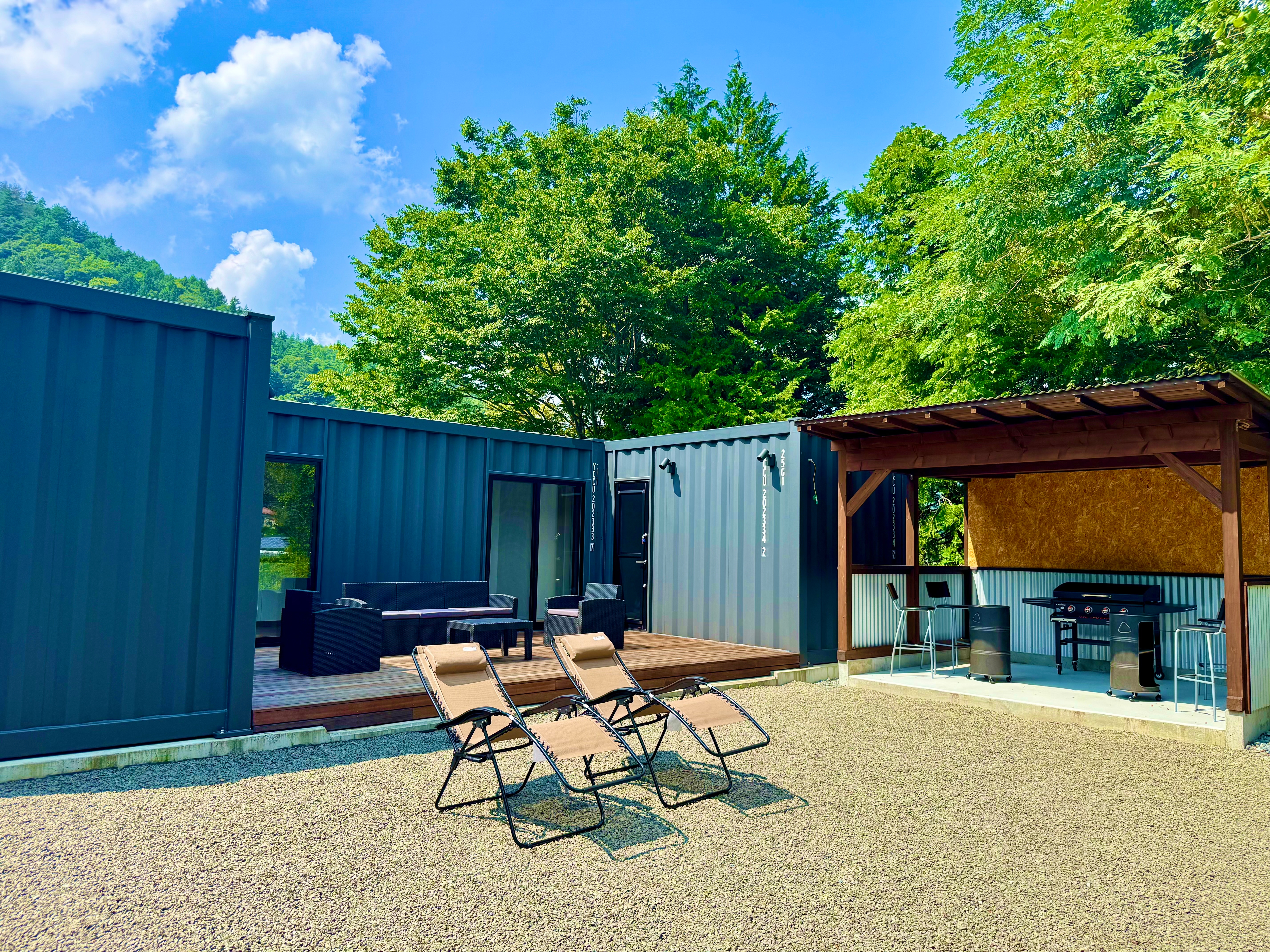 富士五湖エリア近郊!一日一組限定の専用BBQ場付きコンテナホテル。鹿留川のほとりで過ごす穏やかな癒しステイ。